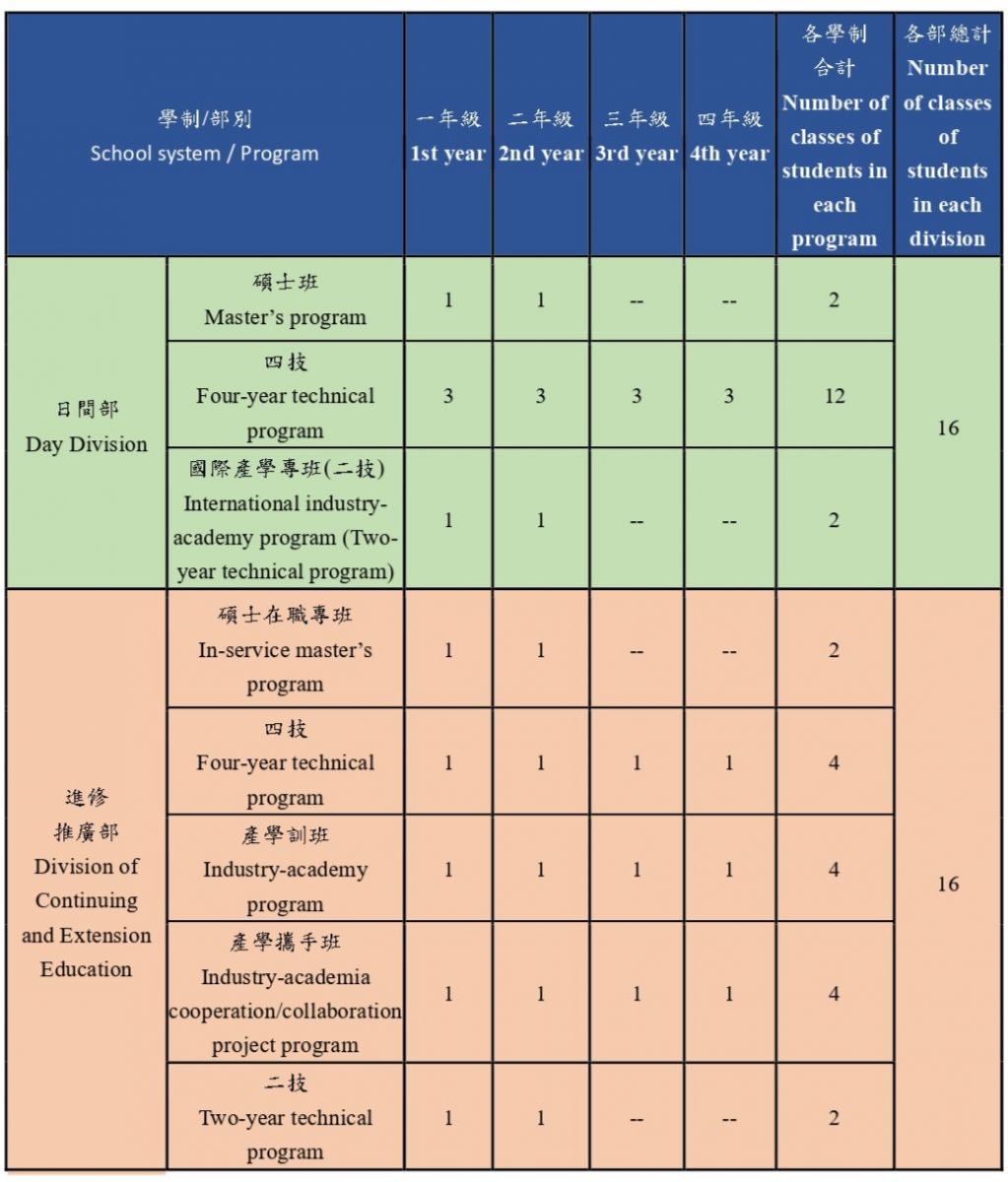 As for the school system and the number of classes in the Department, the Department has 3 classes of students in the four-year program provided by Day Division (i.e. one class for energy application, one class for environmental control, and one class for senior high school students to apply for), the master’s program, one class for students in the four-year program provided by Division of Continuing and Extension Education, one class for the industry-academy cooperation program and the in-service master’s program, one class for students in the two-year program provided by College of Continuing Education. In addition, it has the Ph.D. program provided by Graduate Institute of Precision Manufacturing, College of Engineering, which also provides courses concerning refrigeration, air conditioning and energy. Students may study for a Ph.D. degree continuously. The school system and the number of classes are listed in the following table.