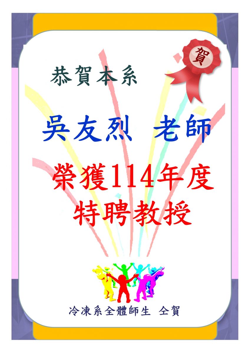 恭賀 吳友烈老師 榮獲114年度特聘教授