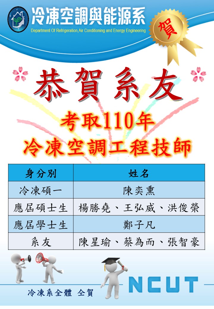 恭賀 110年冷凍系考取冷凍空調工程技師榜單